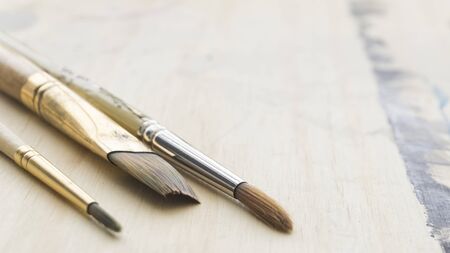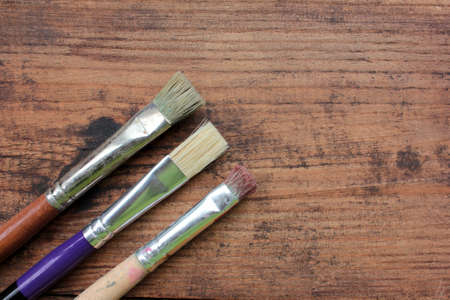 Paintbrushes on wooden background. Top view, copy space. Creative drawing hobby concept