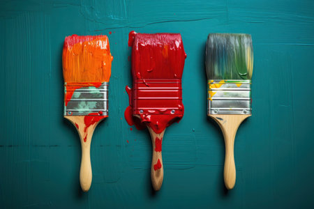 A closeup of vibrant paintbrushes dripping colorful paint onto a surface, showcasing the beauty of artistic expression and creativity through vivid hues and textures.