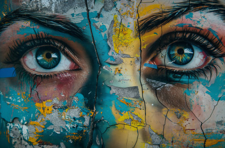 Colorful graffiti of eyes on cracked wall