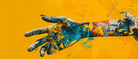 A vibrant, paint-covered hand holding a smartphone with a colorful splattered screen.