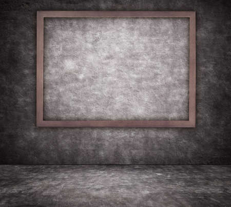 blank whiteboard with wooden frame on dark mottled concrete wall and floor background