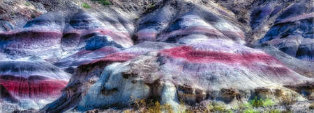 Panoramic views of the arid and colorful landscape of Painted Hills