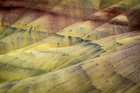 Detail of the arid, wavy and colorful landscape of Painted Hills, Oregon, USA.
