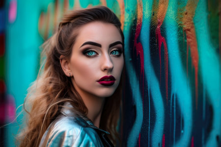 Vibrant portrait of a beautiful woman with turquoise blue eyes and a bold turquoise blue lipstick, posing against a vibrant and colorful graffiti background