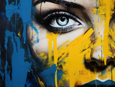 A womans face painted with blue and yellow paint, AI