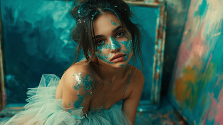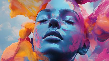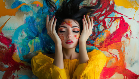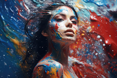 Colorful portrait of a woman with artistic face paint and vibrant splashes of color around her. Creative beauty and self-expression concept.