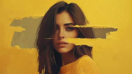 Confident woman with a yellow backdrop, highlighted by artistic torn sections for a contemporary visual effect