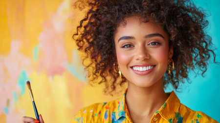 Smiling Young Artist with Brush Against Vibrant Artistic Background.