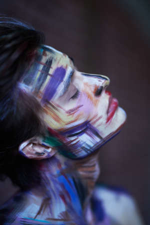 Close-up portrait of a beautiful woman with multicolored paint on her face