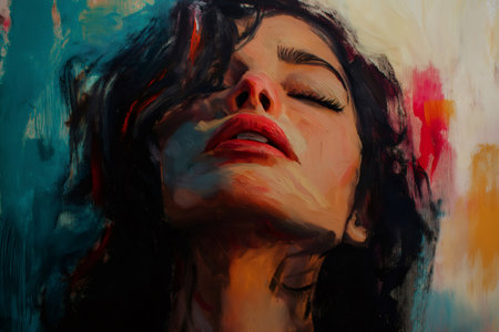 Oil painting of a beautiful woman with closed eyes and red lips, expressing emotion through facial expression and colorful background