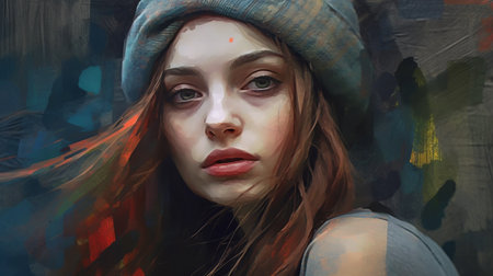 the woman in the image is wearing a hat and has her hair pulled back. the style of the image is painterly with a soft color blending and multidimensional layers. the colors used are dark teal and light red with intense color saturation. the image has a street style realism and is created by andrzej sykut. ai generated