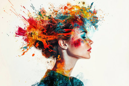 Colorful abstract portrait of a woman with vibrant splashes of paint representing creativity and artistic expression.