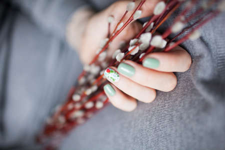 Women's hands with a beautiful matte oval manicure in a warm knitted sweater. Hands are holding a winter branch. Varnish beige nails with gel polish, shellac. Copy space.