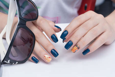 Stylish blue female nails. Modern trendy stylish Beautiful manicure. Autumn winter nail minimalistic design concept of beauty treatment. Gel nails. Skin care. Copy space for text. Beautician advertisement. Wellness. Trendy colors.