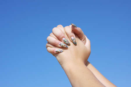 Female hands with multi-colored manicure. Women's hands with manicure.