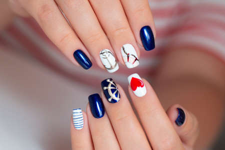 Beautiful female hands with manicure nails in marine style, design with anchor, steering wheel, sea waves, heart