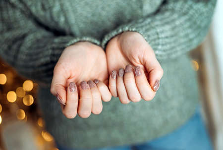 Female hand in gray knitted sweater with beautiful manicure - green glittered nails. Nail care concept