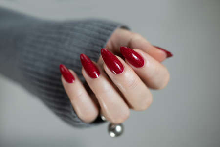 Female hand with long nails and a red manicure holds a bottle of nail polish