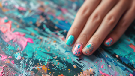 A closeup of a hand with colorful nail polish resting on a palette of paint.