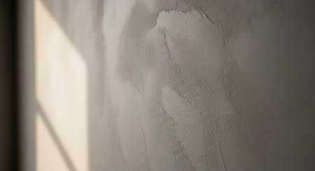 A close-up of a light gray textured wall reveals subtle surface variations illuminated by soft sunlight casting a distinct geometric shadow across it.