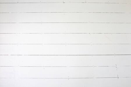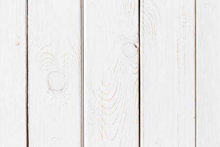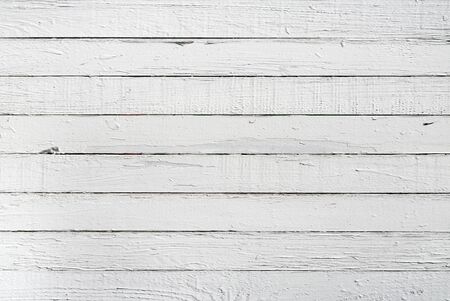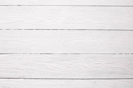 Surface of textured wood planks painted with white paint. Empty background of horizontal white wood boards. Rustic tabletop pattern for design top view. Full frame.