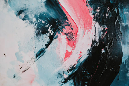Abstract modern art painting with vibrant pink, black, and blue colors, showcasing dynamic brush strokes and textures in a contemporary style