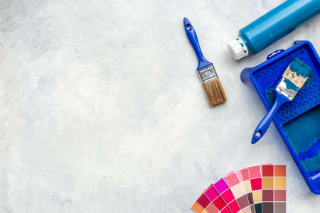Instruments for renovation apartment room isolated on white and blue background. accessories for gluing, painting tools. Colorful paint cans. Concept of repair home. Copy space for advertisement.