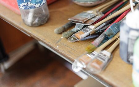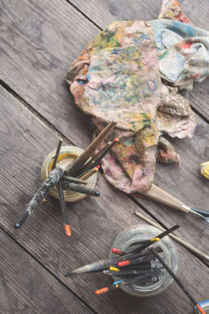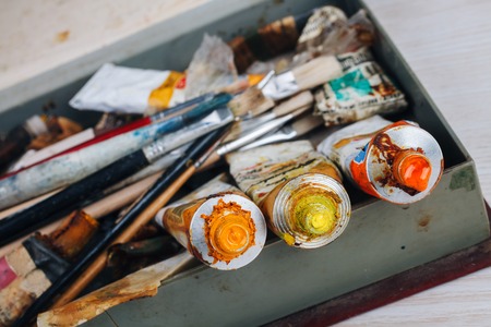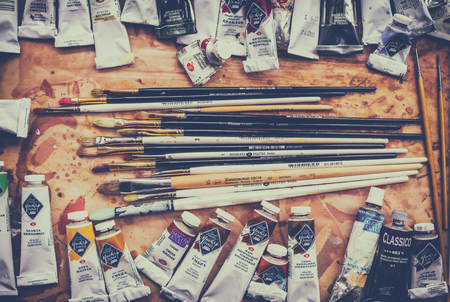 Creative image with oil paints and brushes, close-up, retro style, selective focus, editorial, 4 July 2017