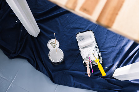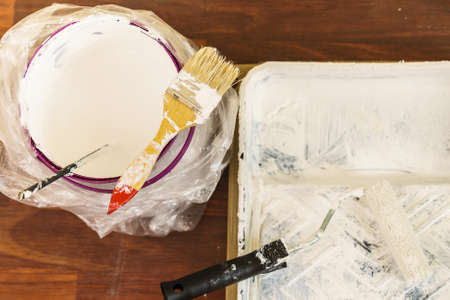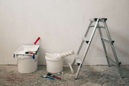 Home renovation, walls color change, diy concept. White paint with essentials equipment.
