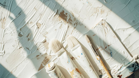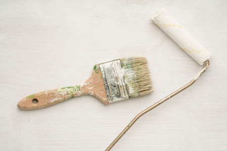 an used dirty paint brush and roller on a white wooden backfround with copy space