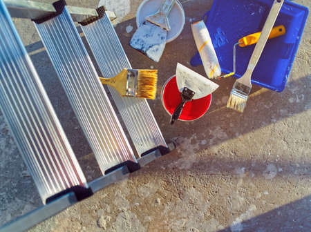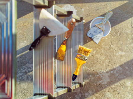 Finishing work in a newly built house, Step ladder and decorator s tools near wall repair tools.