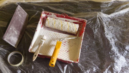 Paint-stained tray and paint roller. Real non-staged view. Background for repair.