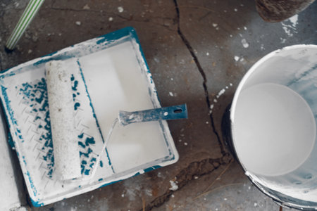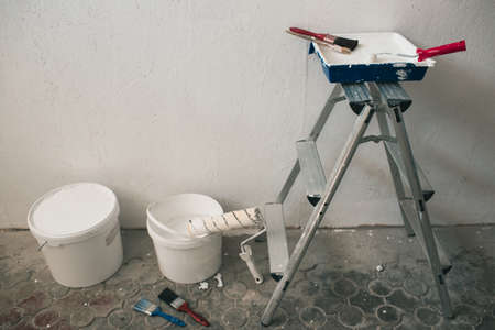 Buckets with paint and brushes stand near the wall. Accessories for repair