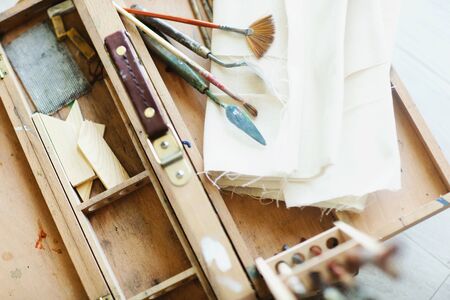 Close up of wooden suitcase artist with brushes, canvas and artistic tools. Art concept.