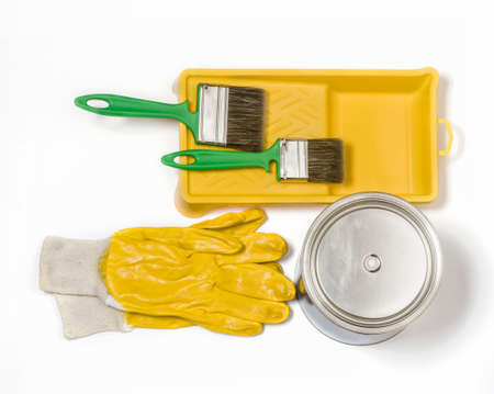 Paint roller and brush isolated on yellow. Painter tools for working with paint.