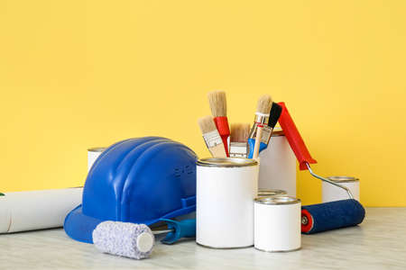 Top view of work tools and safety equipment for professional house painter on a yellow desk