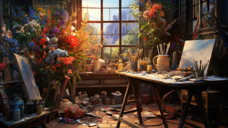 Immerse in creativity with this sunny art studio, showcasing vibrant brushstrokes and artistic tools. Perfect for inspiring your inner artist. Generated A.I.