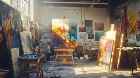 An art studio is illuminated by natural light, showcasing colorful canvases, brushes, and paint splatters. The atmosphere reflects artistic energy and creativity.