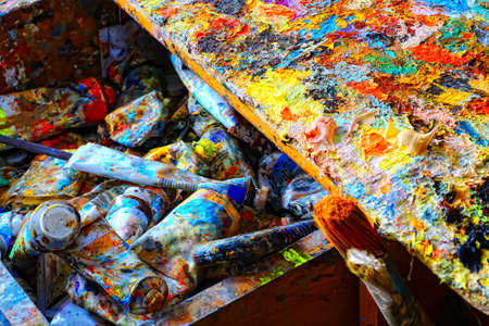Artistic equipment: paint, brushes and knives on paint background