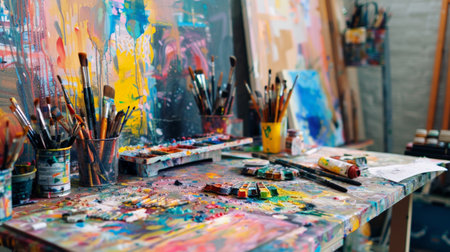 A cluttered work desk with scattered paint brushes and tubes of paint AI generated