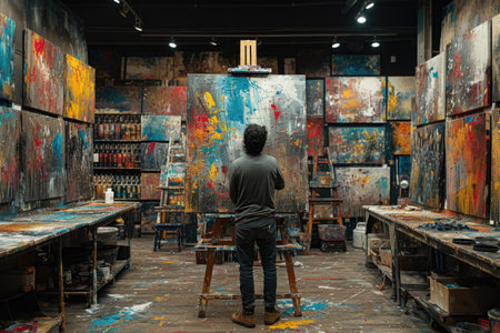 Bustling artist's studio filled with vibrant paintings, art supplies, and a touch of creative disarray