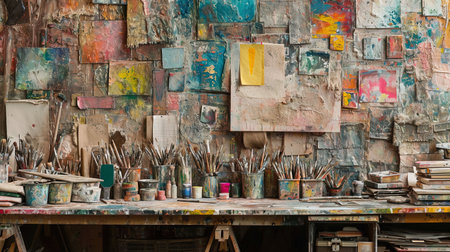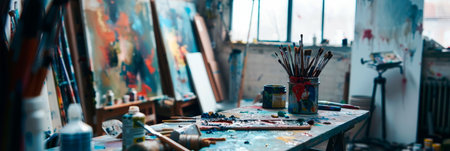 Paintbrushes and art supplies on cluttered artist's desk in lively studio