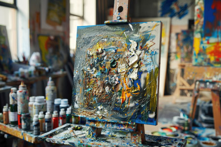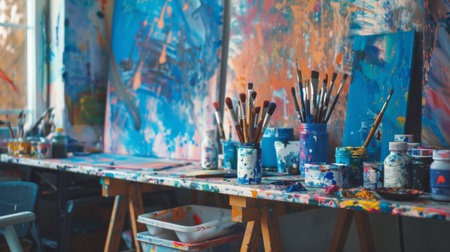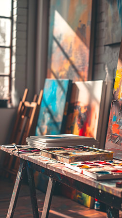 An artistic workspace filled with colorful paints, brushes, and easels, inviting creativity during a sunny day in the studio.