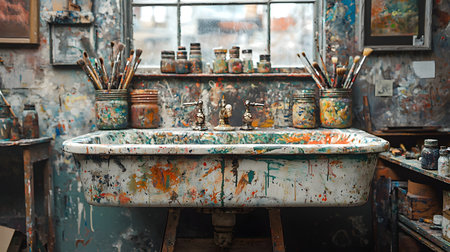 An old, paint-stained studio sink sits under a dusty window. Jars of paintbrushes and supplies clutter the workbench, telling a story of a long creative process