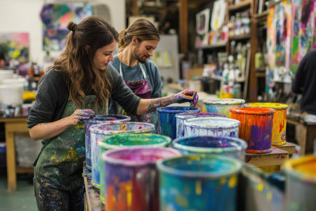 Two artists mix colorful paint in an energetic studio filled with inspiration and creativity.