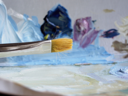Artistic palette with paint brushes and oil paint