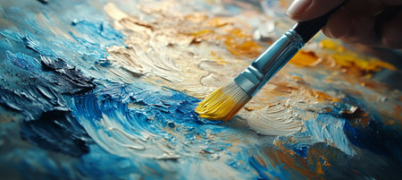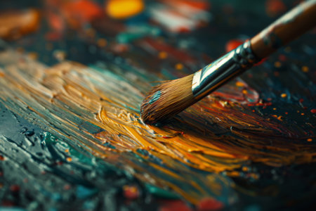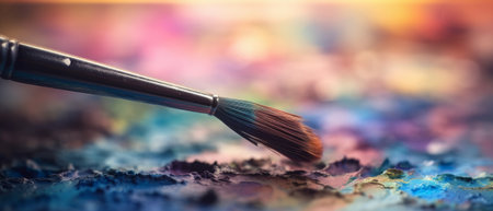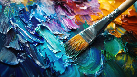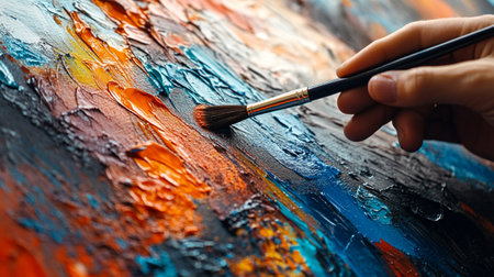 Close-up of paintbrush on vibrant abstract canvas, blending colors