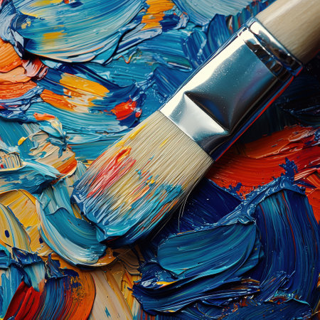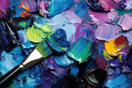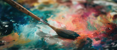 A close-up view reveals an artist's brush loaded with vivid colors sitting on a textured palette. Natural light emphasizes the lively hues and details of the paint blending together.