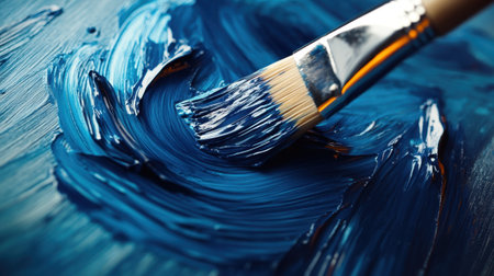 A close-up view of a paint brush mixing vibrant blue oil paint on a textured canvas. This image highlights artistic creativity and the beauty of color.