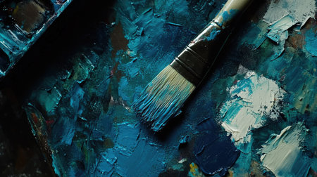This image showcases a vibrant artist's palette featuring various shades of blue and teal paint, with a brush ready for creative expression and artistry.